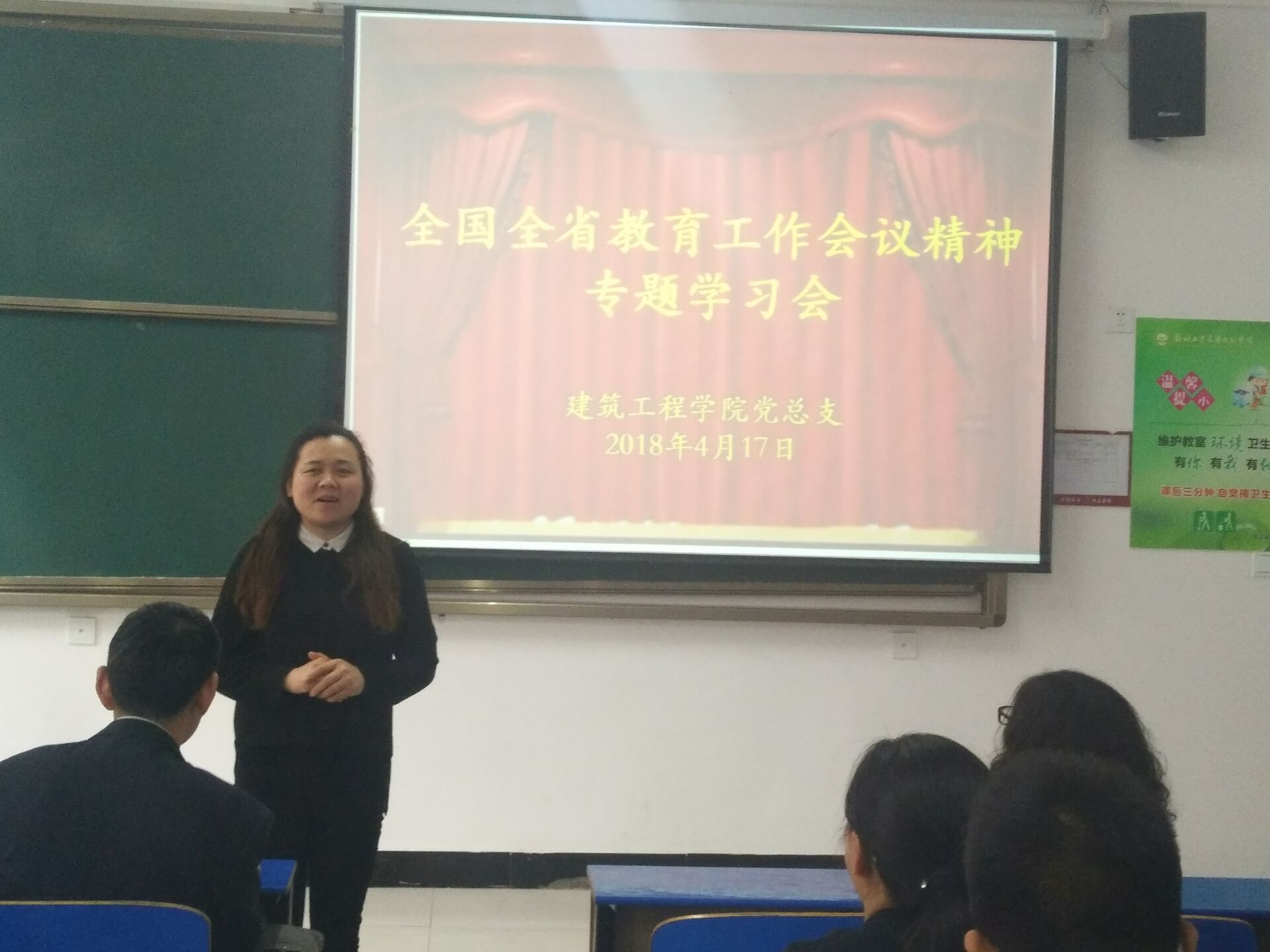 (文图/陈豆)2018年4月17日下午16:40,公司党总支组织全院教职工在建工楼南109教室召开了政治理论学习会议,重点学习2018年全国、全省教育工作会议精神,会议由谢晓杰副经理主持。