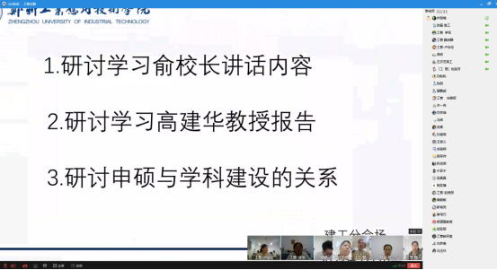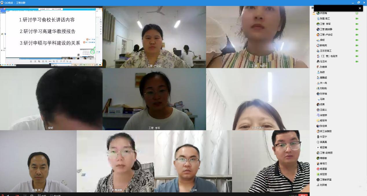(文图/刘盼盼 陈硕 编辑/郝亚勋)7月10日晚上,工程管理教研室针对俞海洛董事长讲话内容、高建华教授报告、硕士专业学位授权单位(点)培育与团队建设进行了线上研讨学习。会上,主持人深刻总结了学习内容并发表感言,其他教师也积极、认真的进行了讨论。