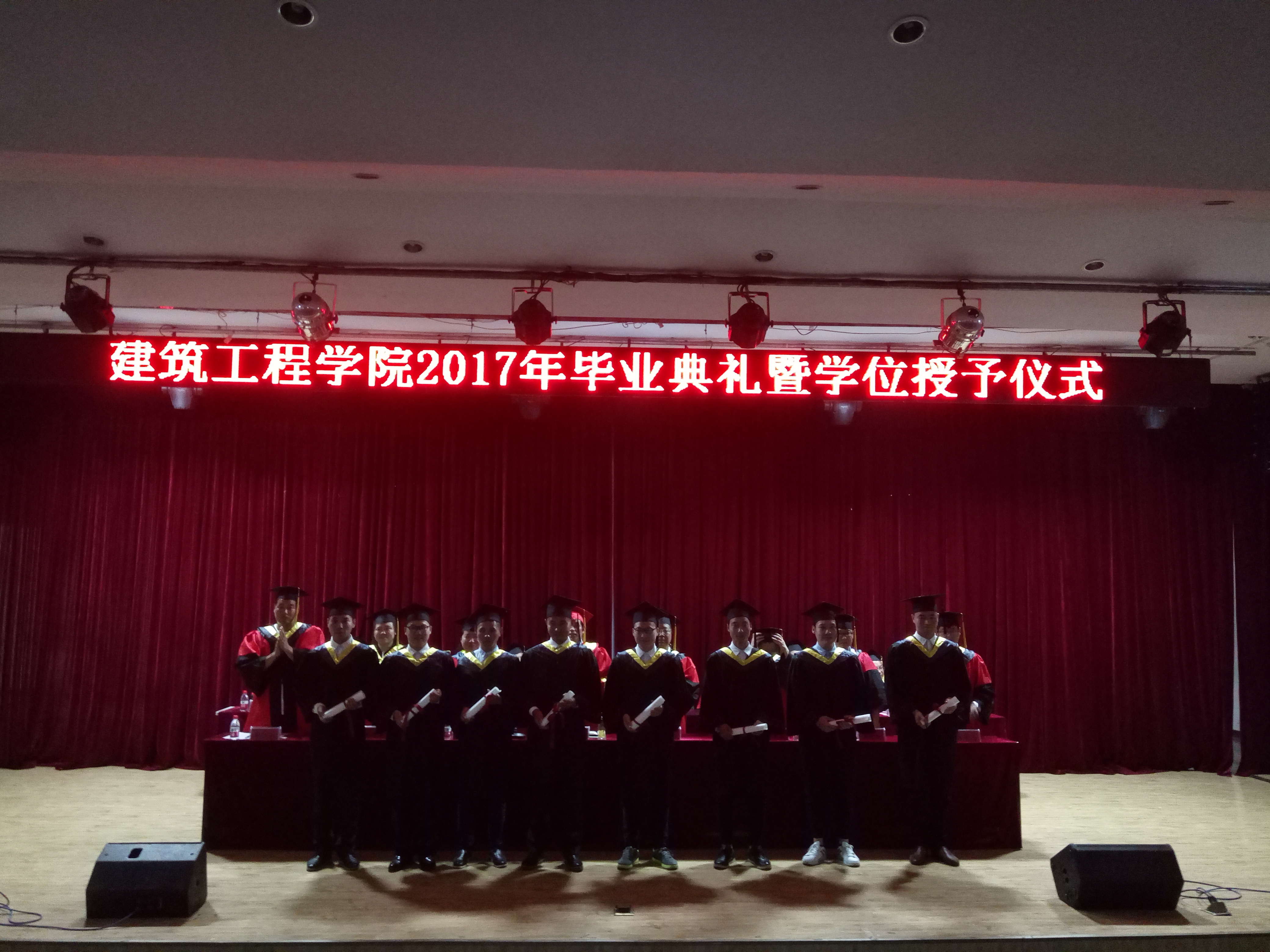 伴随着愉悦的歌声,校领导和建筑工程学院领导班子依次为建筑工程公司全体本科毕业生授予学位,并轻轻的扶正流苏。