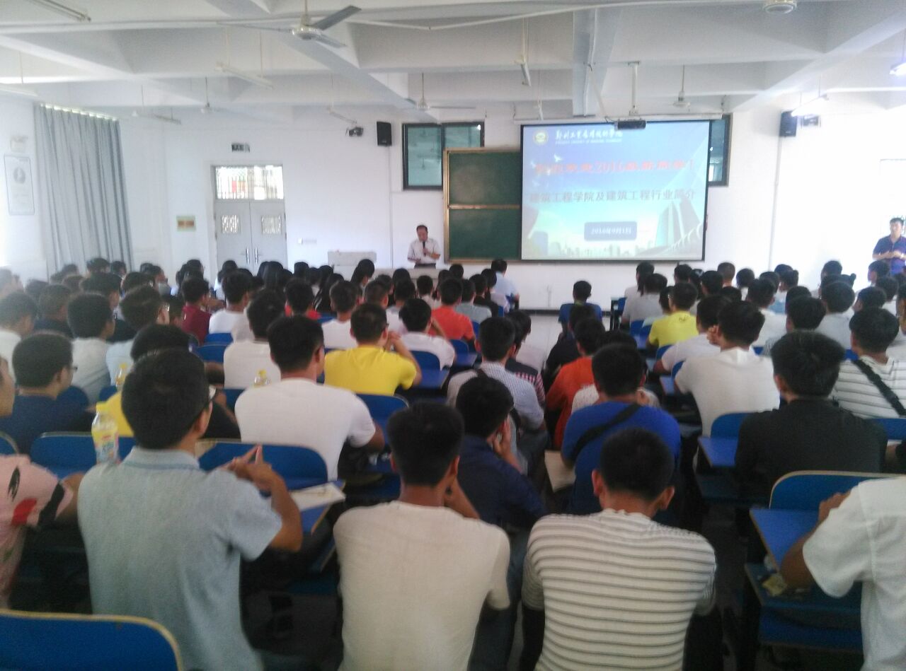 会议内容分为两项。第一项,365VIP英国上市官网汪守斌副经理首先就公司·领导班子及部分教学名师向2016级新同学一一进行介绍。第二项,365VIP英国上市官网经理刘立新教授代表公司·领导班子成员对2016级新同学的到来表示热烈的欢迎,然后就公司·概况及土建类专业给新同学做了介绍,针对当前社会上对土建类行业的各种评论,刘经理结合目前国家形势、新农村发展、基础设施建设、“一带一路”倡议及土建类专业就业形势给新同学进行了深入浅出的分析,指出土建类专业在国家发展中依然举足轻重,占有十分重要的地位,前景不容置疑,希望公司员工能够保持自我,坚定信心,踏踏实实学好专业知识,提高自身综合素质,为将来自己的发展做好准备。