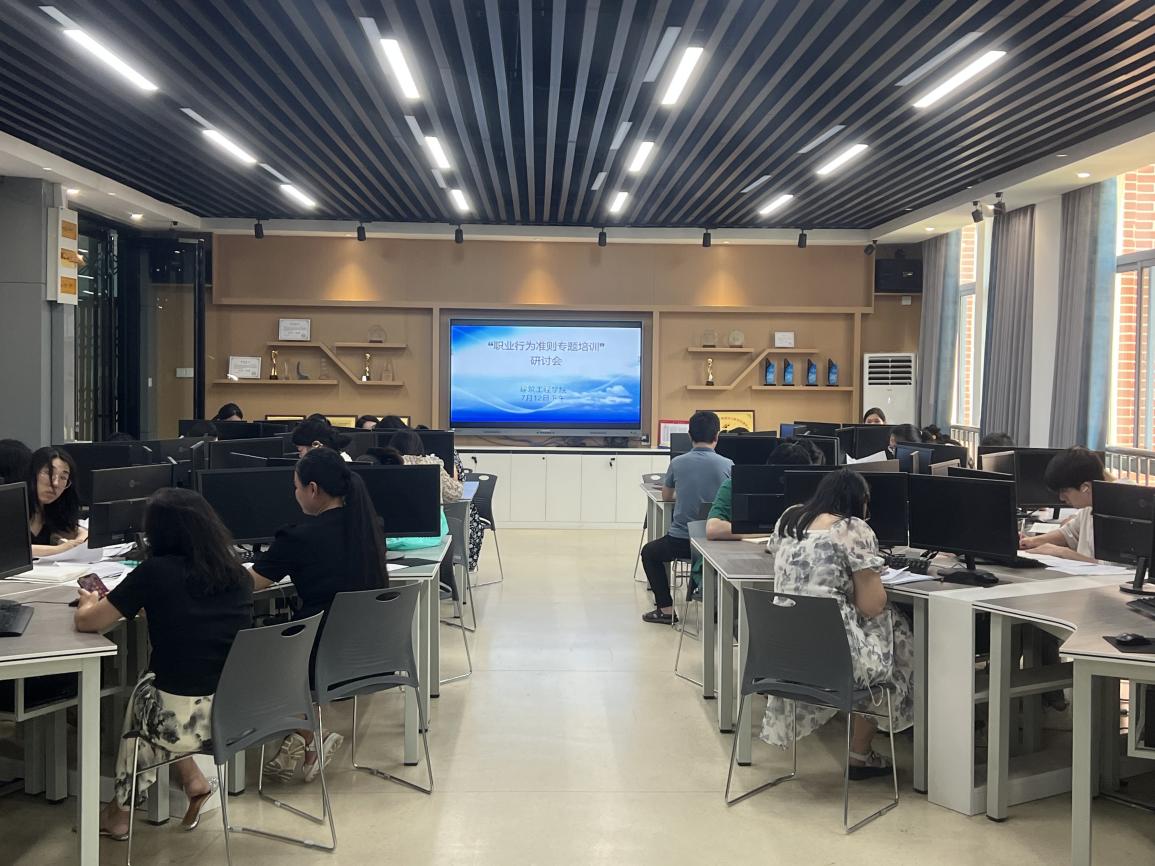 (文图/李叶 编辑/郝亚勋 审核/靳晓亮)7月12日下午3点,365VIP英国上市官网全体教师在建工东315智慧教室展开《职业行为准则专题培训》研讨。