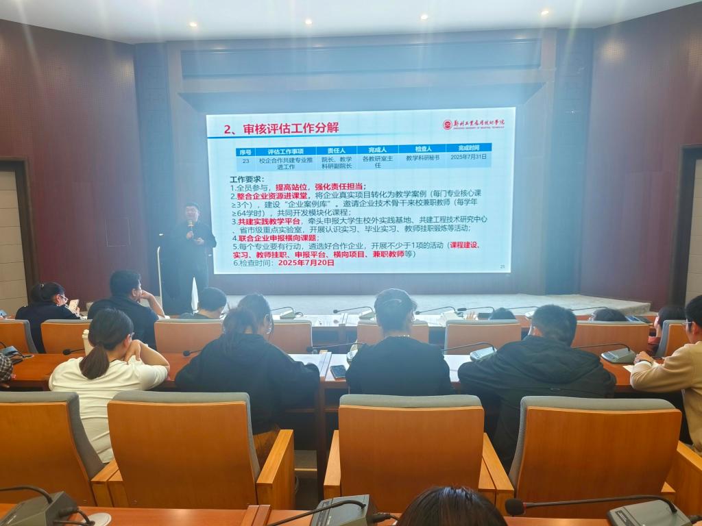 会上,副经理靳晓亮作讲话。他结合公司审核评估文件精神,对材料规范与核查、教师能力提升、教学质量保障等重点工作进行了安排部署,并对审核评估内容、指标、评估任务分解等进行了详细解读。他指出,本科公司产品审核评估是公司·深化教学改革、提升人才培养质量的“关键抓手”,全院上下要以“精益求精、追求卓越”的态度落实各项任务。
