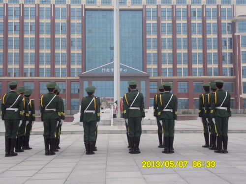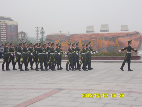 全体师生在六点集合完毕,6:30英姿飒爽的国旗护卫队队员,迈着矫健整齐的步伐,护卫五星红旗走向升旗台。在高亢、激昂、嘹亮的国歌声中,师生们表情肃穆,怀着最崇高的敬意,目视五星红旗冉冉升起。