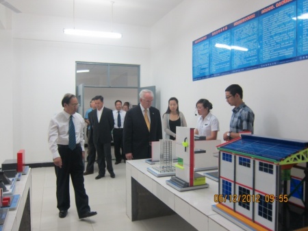 随后参观了土木工程实验中心的建材、力学、土工、模型和测量等实验室。在模型室,Bob Holden先生兴致勃勃的观看了精美的建筑模型和建筑仿真模型演示,给予了极高的评价。