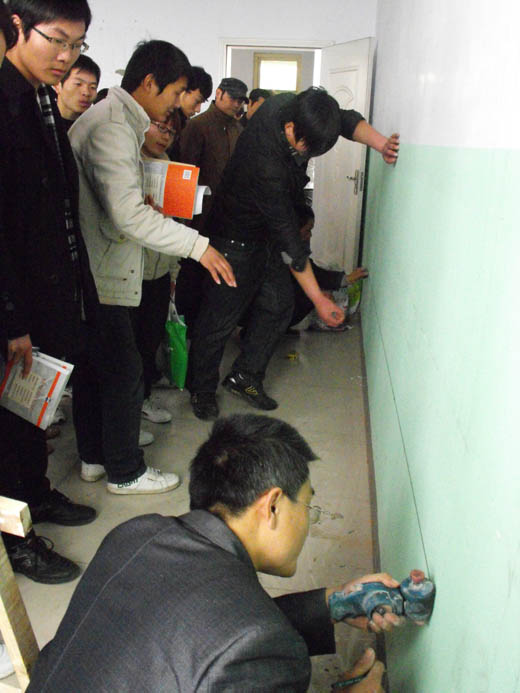 本学期公司在所开设的《建筑装饰构造》课程中,应用了这一创新型校企合作的模式,进行了一项综合性的案例特色教学。公司聘请到了郑州星星装饰公司资深设计师赵保玉老师和公司的施工团队,以及他们所带来的材料、设备、工艺、技术等资源,开展为期近两个月的建筑装饰构造综合项目教学,主要包括水电改造工程、泥工工程、木工工程、涂裱工程、安装工程、整体工程构造实操训练六个学习项目。2011年3月8日和10日上午,在赵老师的指导下开始了第一项水电改造工程的实施,在现场的教学中,我们感受到了员工学习的积极性和强烈的求知欲。通过这第一阶段的学习,取得了很好的教学效果,这一特色的教学得到了员工们的一致好评。