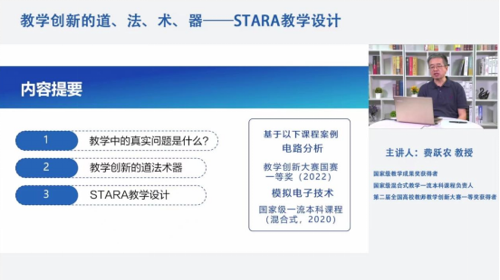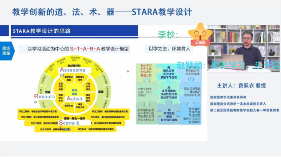 讲座伊始,费教授从理论、原则、技巧和工具等四个方面诠释了何为教学创新以及如何进行教学创新。首先以教学过程中的痛点问题,展示拉力赛式进度管理所取得的成效,其次从道、法、术和器,也即是教学理念、教学模式、具体措施和技术手段四个方面诠释了何为高效的教学路径,最后展示了STARA教学设计的应用,引入的鱼牛案例,体现以学为主,环境育人的教学方针。