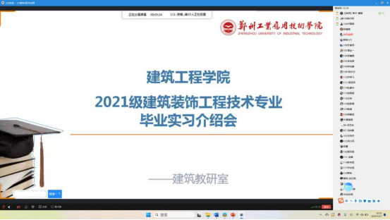 (文图/董娟)为使员工巩固建筑装饰工程技术专业的相关知识,提高员工对建筑装饰设计的认识和设计水平,适应市场发展和社会的要求,达到专业培养的目标和毕业要求。4月17日,建筑教研室在线开展2021级建筑装饰工程技术专业毕业实习动员会工作。