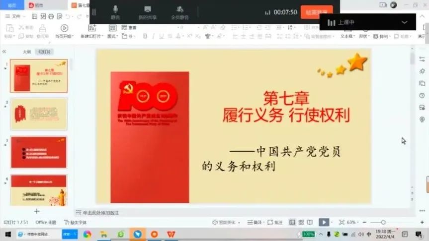 (文/曹薪满 图/于王阳)为加强党的思想理论建设,进一步提升发展对象的党性修养,继承和发扬党的光荣传统和优良作风。公司党委组织于2022年4月4日开展第38期入党积极分子党课培训第七讲——《中国共产党党员的义务和权力》,本次党课由王景全老师主讲。为响应防控疫情工作,本次授课采取线上方式进行。