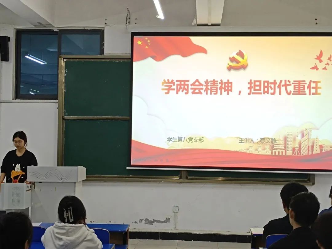 会议伊始,蔡文静同学从什么是两会、开展两会的目的、如何学习两会精神三个部分讲述了学习两会精神的重要性和意义。随后,蔡文静同学强调了开展两会目的是为了保证国家权力体现人民的意志、保证中央和地方国家权力的统一、保证我国各民族的平等和团结。会议最后,蔡文静同学通过讲解两会的起源与发展加深了支部成员们对两会的了解,增强了支部成员们的理想信念。
