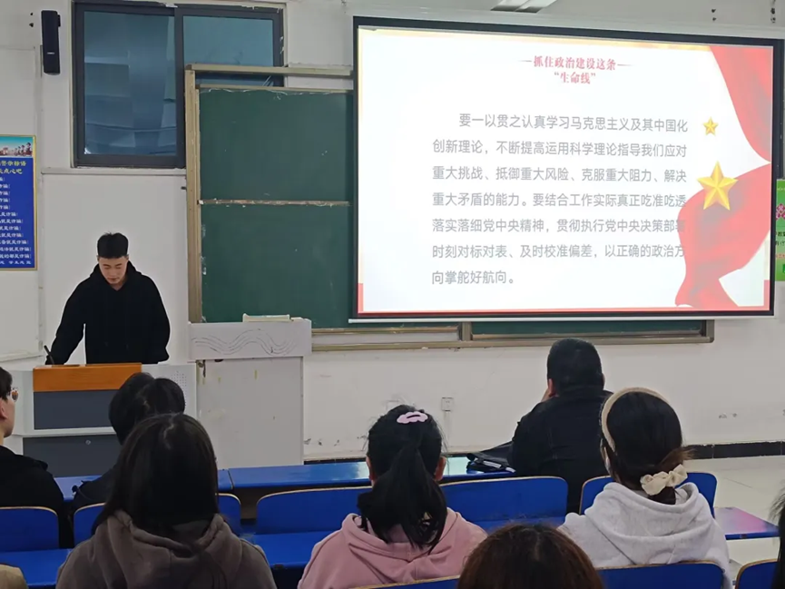 会议伊始,王佳鹏同学指出了学看家本领当行动派实干家的重要性。随后,王佳鹏同学分别从抓住政治建设这条“生命线”、把握人民至上这个“总航标”、校准担当作为这个“定盘星”、坚持学思践悟这个“驱动力”四个方面详细的介绍了学看家本领当行动派实干家的意义是提高综合素质,更好地服务人民群众,推动各项事业发展。最后,王佳鹏同学提到我们要积极投身各项工作,以实际行动推动党的事业发展。