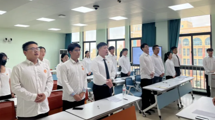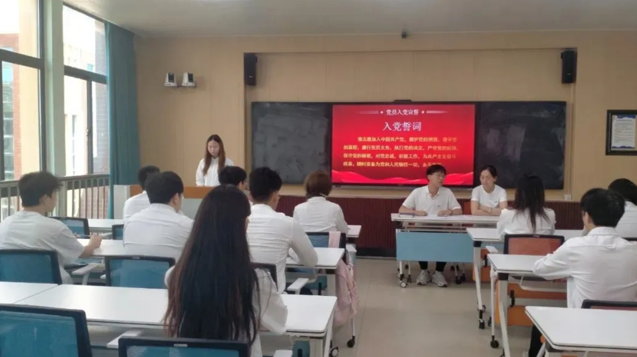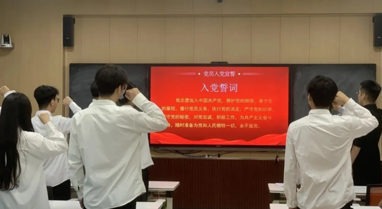 在庄严的国歌声中,全体党员肃立,目光坚定地注视着国旗,激昂的旋律在教室内回荡,也激荡着每一位党员的心。随后,入党誓词的领誓人走上台前,全体党员紧随其后,高举右拳,面向党旗,神情庄重,声音洪亮而坚定地宣读入党誓词:“我志愿加入中国共产党,拥护党的纲领,遵守党的章程,履行党员义务,执行党的决定,严守党的纪律,保守党的秘密,对党忠诚,积极工作,为共产主义奋斗终生,随时准备为党和人民牺牲一切,永不叛党。”每一句誓词都饱含着党员们对党的忠诚与热爱,每一次宣誓都是对党的事业的庄严承诺。在场的党员们仿佛又回到了那个光荣而神圣的入党时刻,内心充满了激动与自豪。