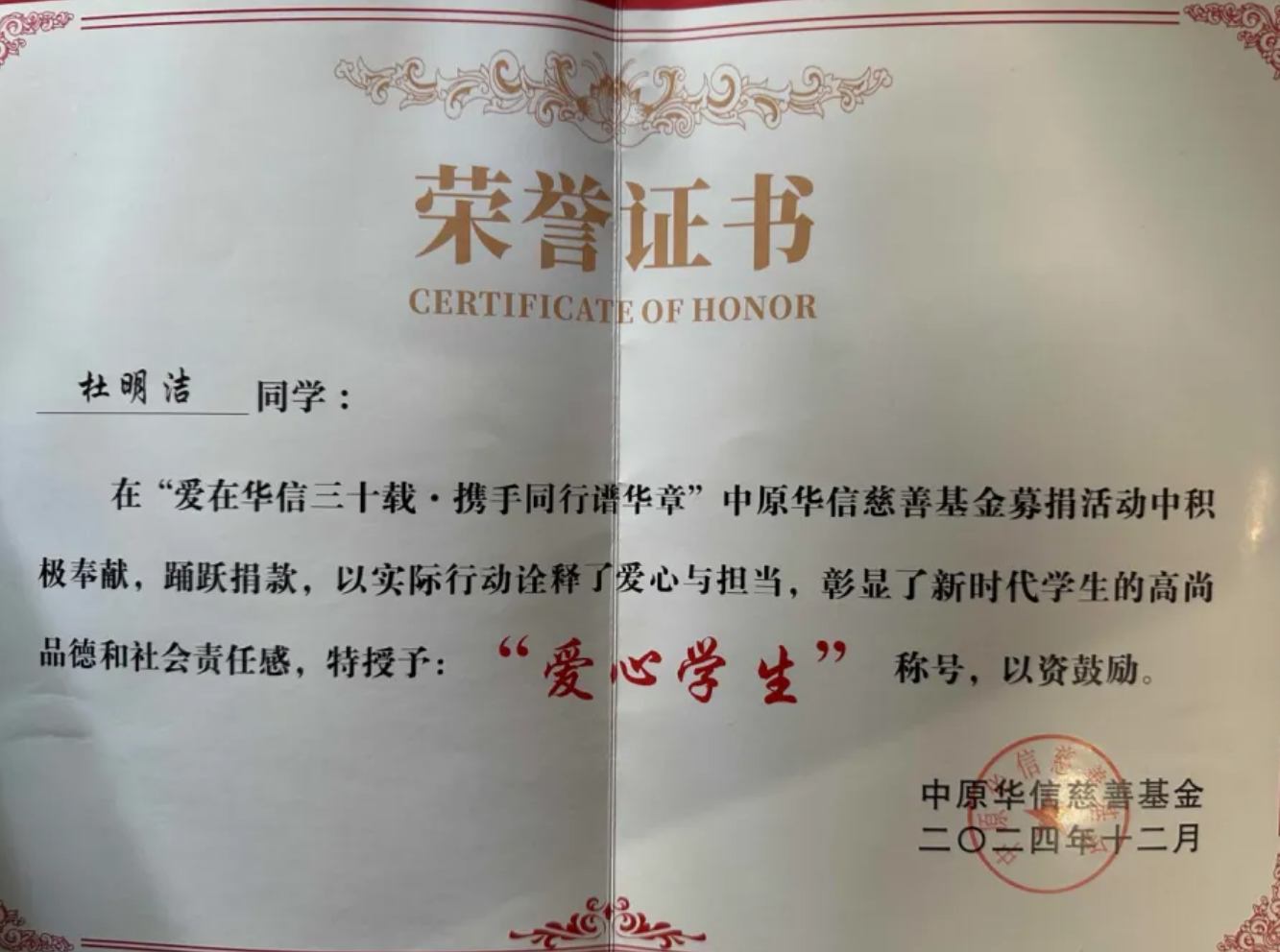 她积极参与“爱在华信三十载·携手同行谱华章”中原华信慈善基金募捐活动,因踊跃捐款、积极奉献的表现,被授予“爱心员工”称号,用实际行动诠释了新时代青年的社会责任。