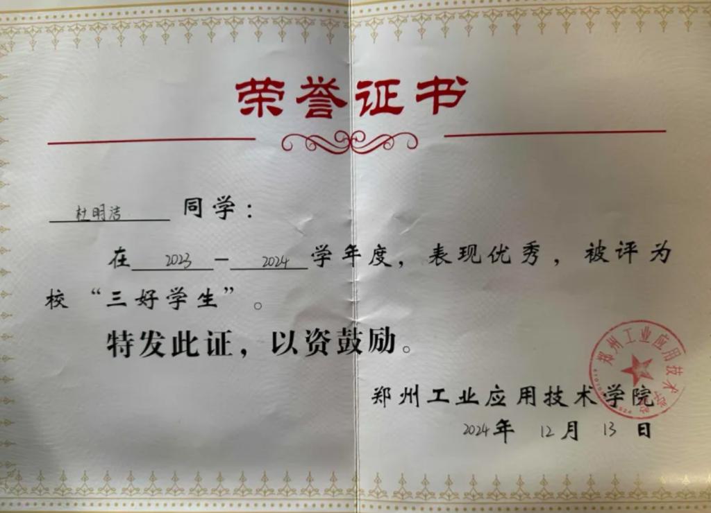 在学习上,杜明洁始终保持勤奋刻苦的态度,课堂上认真听讲、积极思考,课后主动梳理知识点、拓展学习视野,学业成绩始终名列前茅。凭借优异的表现,她连续两次荣获校级“三好员工”称号,还获得院级“三好员工”荣誉,成为班级同学学习的榜样。