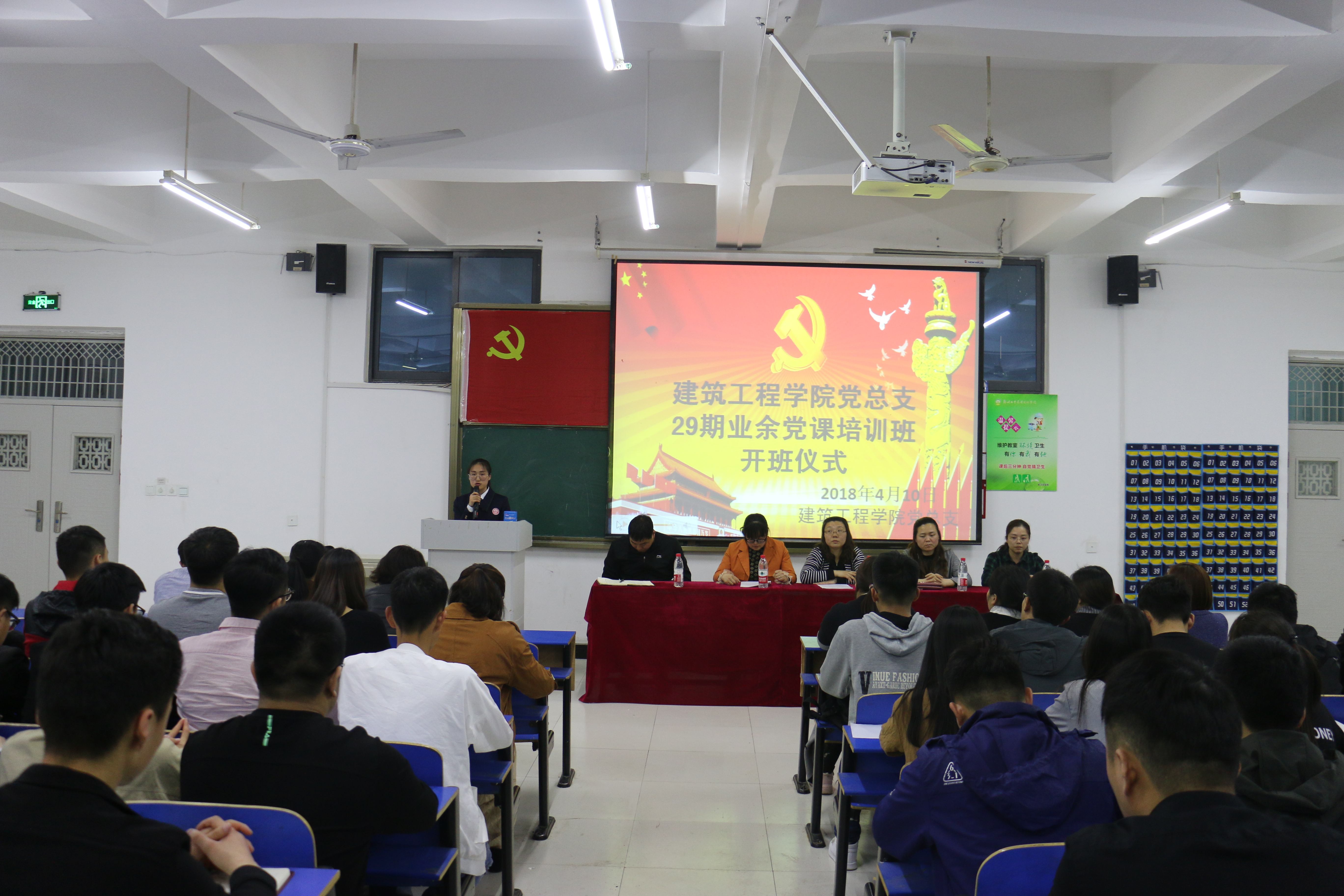 4月11日晚 , 公司党总支29期业余党校培训班开班仪式在北二教室隆重举行, 公司党总支委员、全体辅导员和268名入党积极分子参加了本次开班仪式。