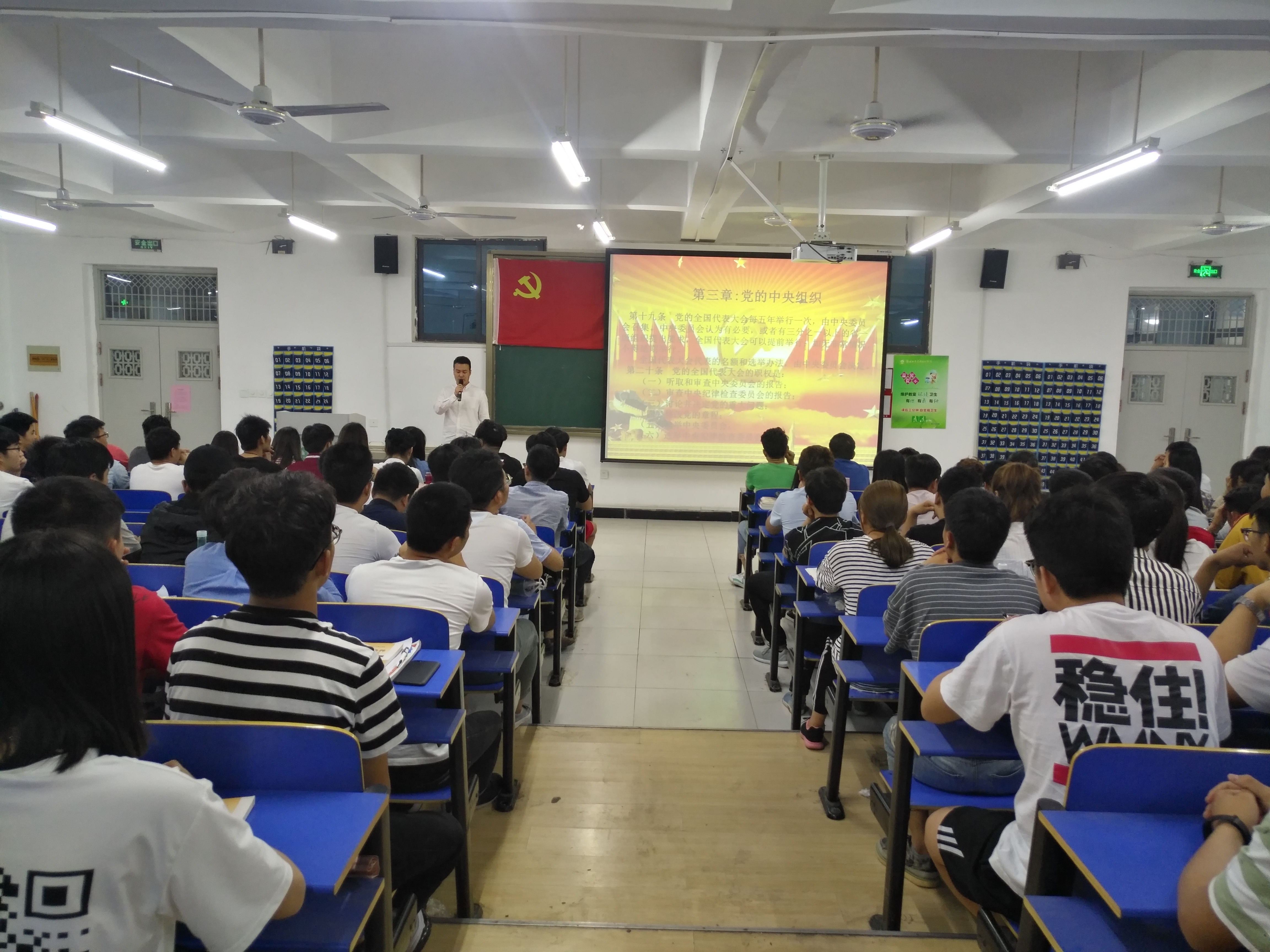 5月9日晚上6点50分,第一党员工作站办公室主任李忠斌同志带领全体党员在建工楼北二教室学习了《中国共产党党章》党的中央组织和党的地方组织部分。