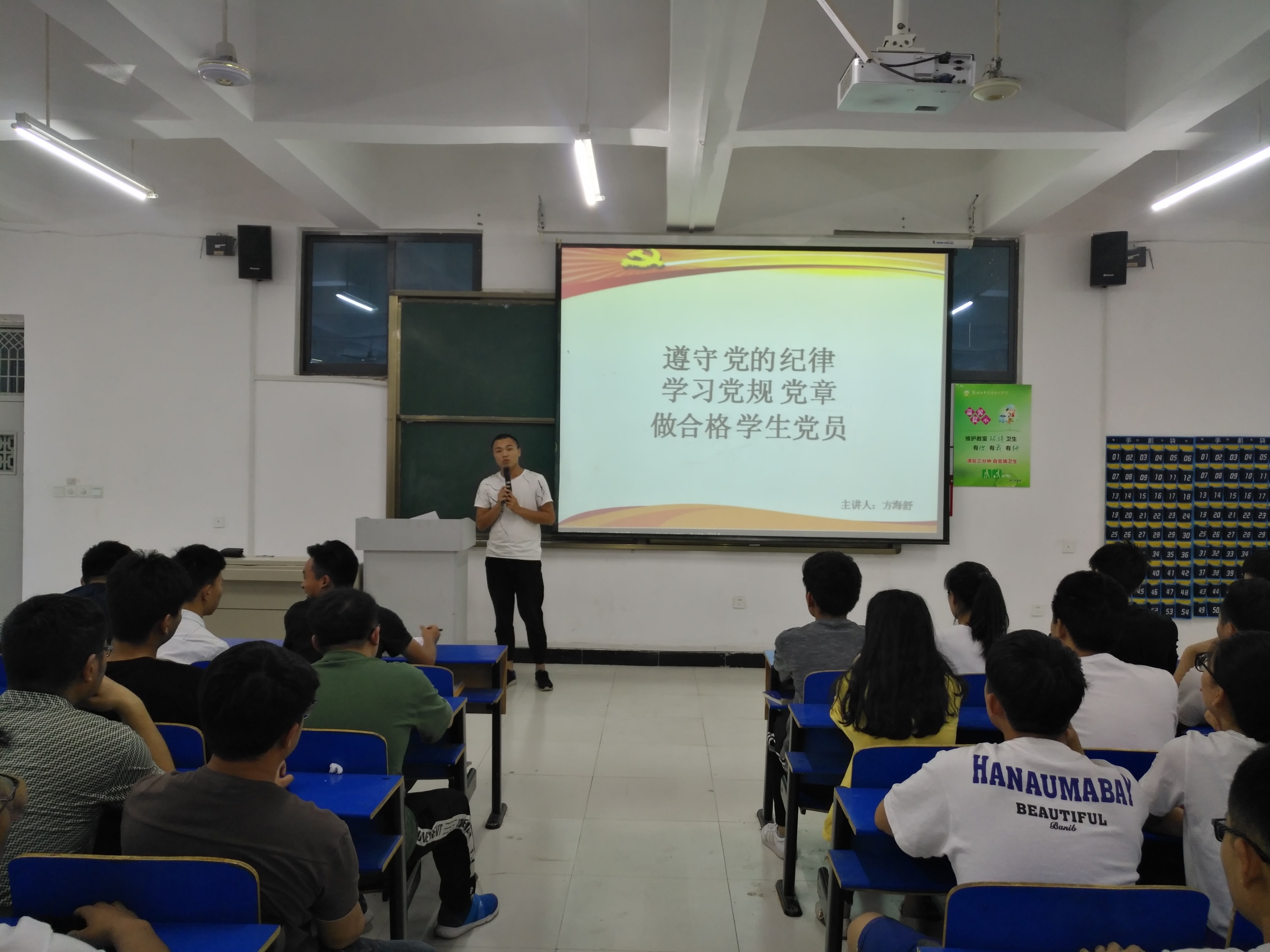 5月30日晚上6点50分,第一党员工作站组织全体员工党员和积极分子在建工楼北二教室学习了以“遵守党的纪律、学习党规党章、做合格员工党员”为主题的微党课,本次微党课的主讲人为督察部部长方海舒同志。