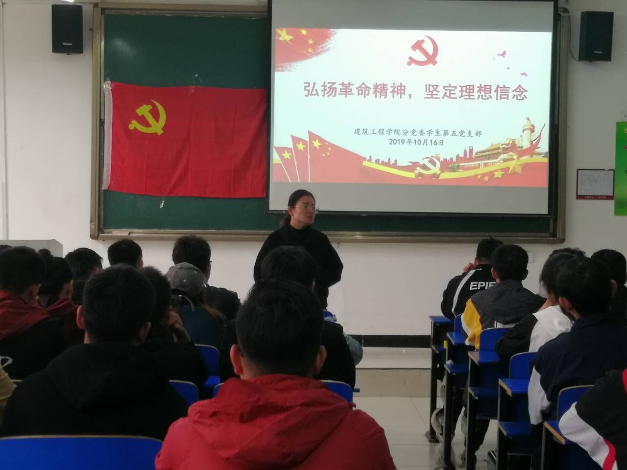 为贯彻落实公司“不忘初心、牢记使命”主题教育工作安排,10月16日,员工第五党支部结合公司实际情况,在建工南楼101教室召开以“弘扬革命精神,坚定理想信念”为主题的专题教育会议,参会人员有员工第五党支部书记陈豆、员工第五党支部全体成员,会议由陈豆老师主持。