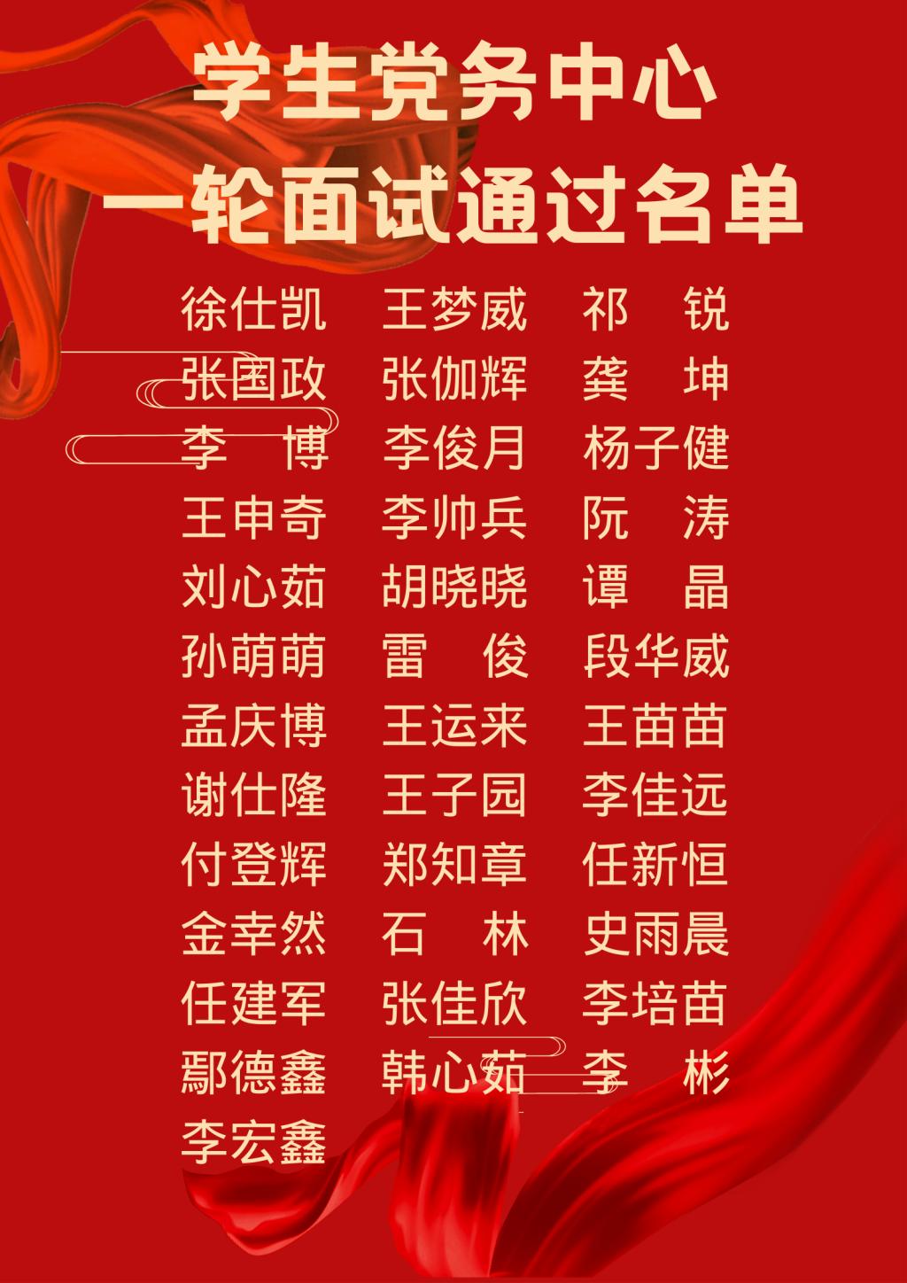 (文/陈志杭 图/徐富森)经过员工党务中心成员公平公正的投票筛选决定出成功通过第一轮面试的同学,名单结果公示如下: