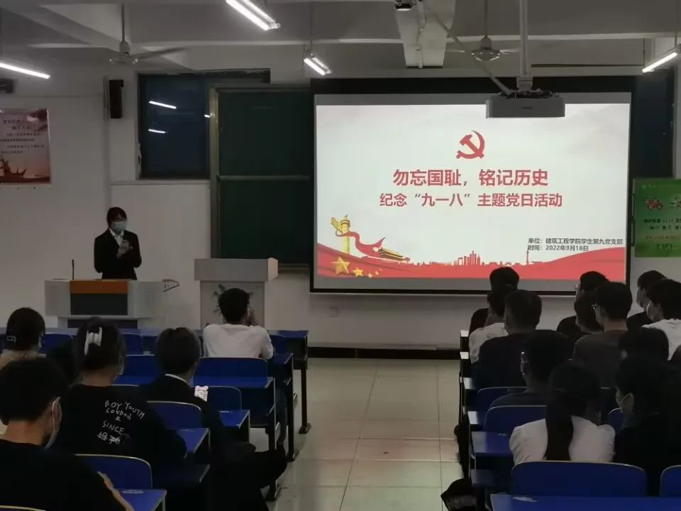 会议伊始,第九支部全体成员在王欣蒙同志组织下起立默哀一分钟,为在“九一八事变”惨遭杀戮的同胞们以及牺牲的革命烈士们哀悼。此次默哀活动,是为了让后辈们铭记历史,勿忘国耻,不能让先辈们白白牺牲,同时带着先辈们的期望,砥砺前行,祈愿他们借后辈之眼,再来这盛世看一看。随后,她通过讲解再现1931的今天,日军炸毁南满铁路路轨,却反诬是中国军队所为,并以此为借口,突然进攻中国军队驻地北大营和沈阳城,制造了震惊中外的“九一八”事变,并在此后对东北人民进行了极其残暴的殖民统治和掠夺。让大家看到了大片国土沦陷,3500万同胞伤亡的悲痛画面,然而,中华儿女面对残暴侵略者,永不低头,英勇顽强斗争,用血肉筑成新的长城,谱写了一部部可歌可泣的悲壮诗篇。91年过去,硝烟虽散尽,但中国人民绝不会忘记中华民族遭受的战争苦难,更不会忘记浴血奋战的革命先辈。致敬革命先烈,让英雄精神代代相传!我们不能忘也不敢忘这一值得我们铭记终身的历史事件。