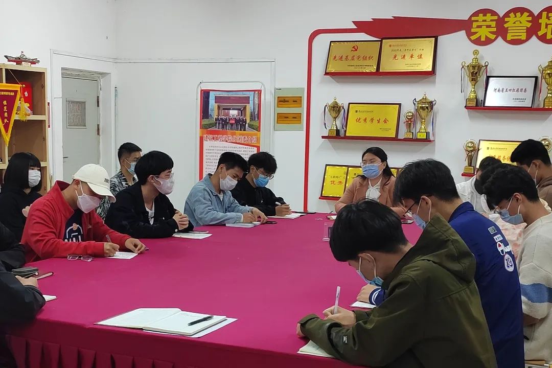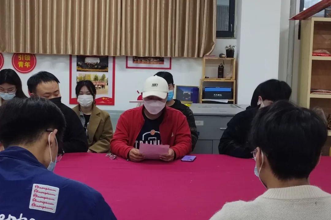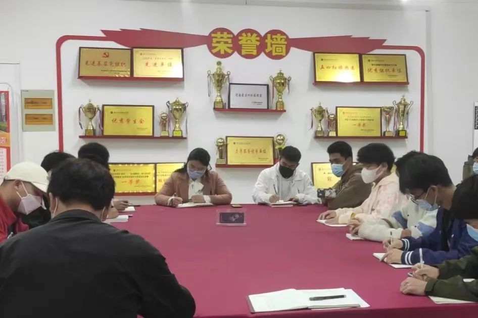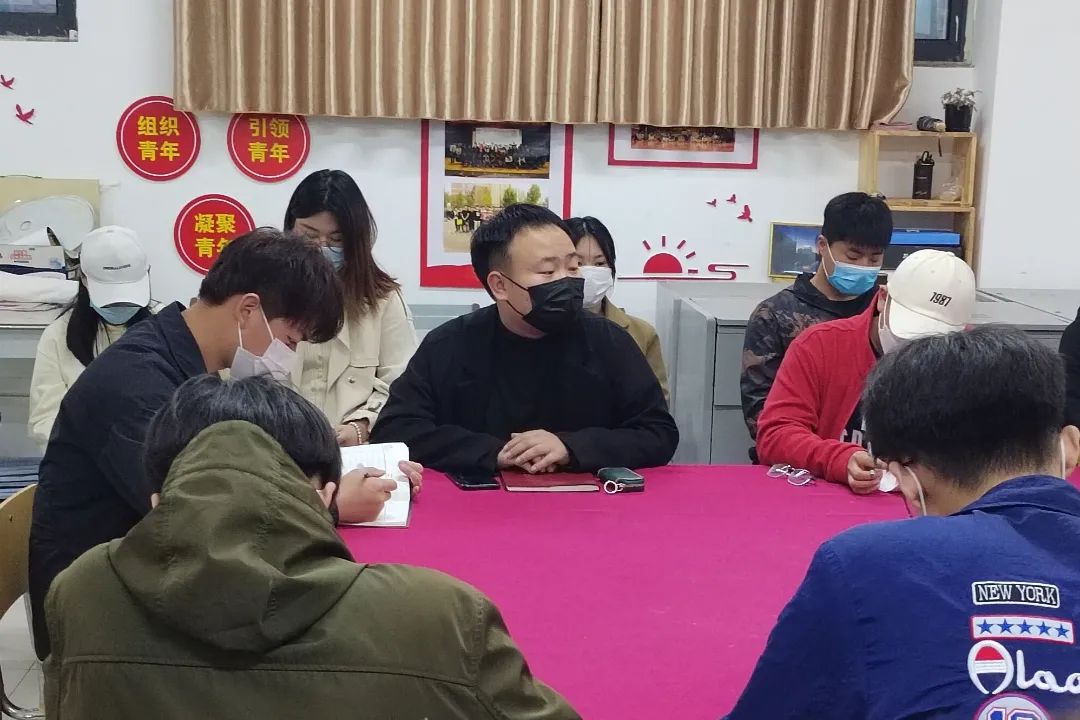 分团委书记刘贝贝老师带领全院各级员工组织学习王董事长在2022年员工工作会议上的讲话精神,并且让大家牢记王董事长的“十个会”讲话精神,各位团学干部认真学习并且记录笔记。
