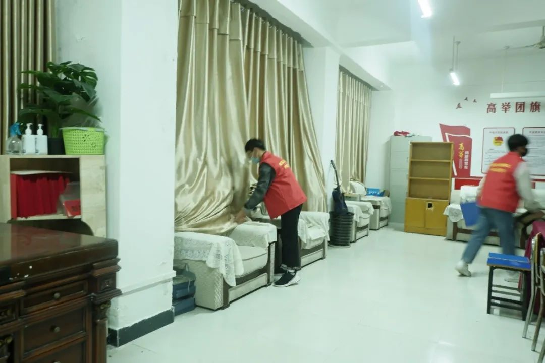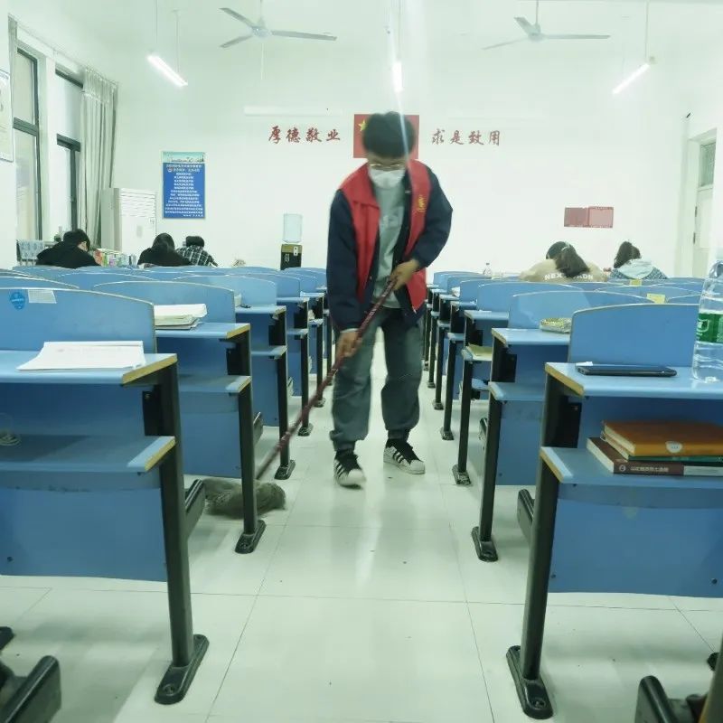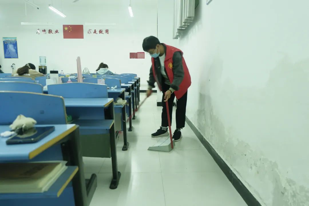 青年志愿者始终秉持“为同学服务”的初衷,从同学们的需求着手,将服务同学的一件件小事、急事落到实处。打扫过程中,志愿者们分工明确,协调配合,对各个自习室的地面、窗台、桌椅等均进行了打扫和擦洗,经过志愿者认真细致地打扫,自习室的卫生环境变得更加整洁有序、焕然一新。