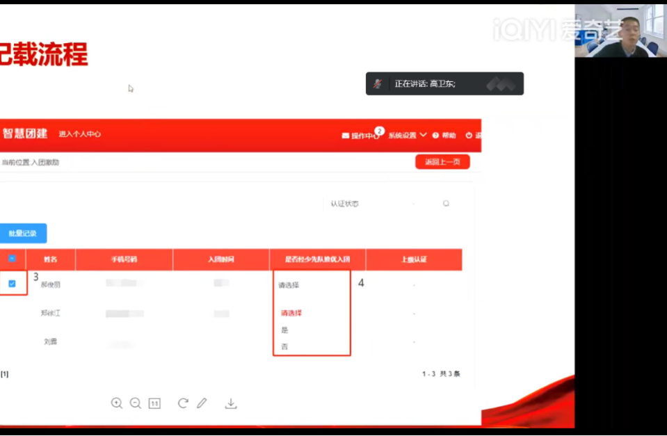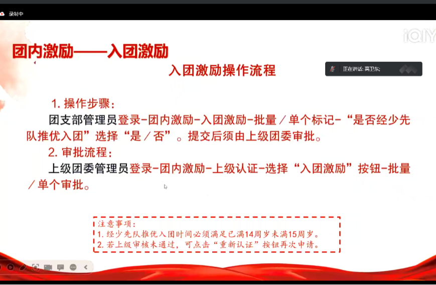 在会议上,高卫东同学先对“智慧团建”系统的功能、团员(团干部)管理、组织构建、团员教育评议等内容进行了详细讲解;通过共享屏幕演示对系统录入进行操作,然后播放校团委下发的视频,帮助各班团支书全面地掌握系统操作流程和工作要点;详细讲解了“智慧团建”中教育实践部分的录入、推优入党记载等,耐心回答了各团支书的问题;