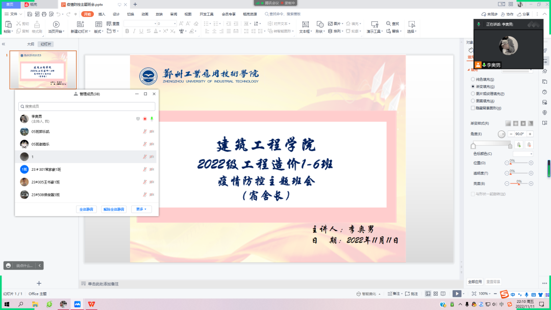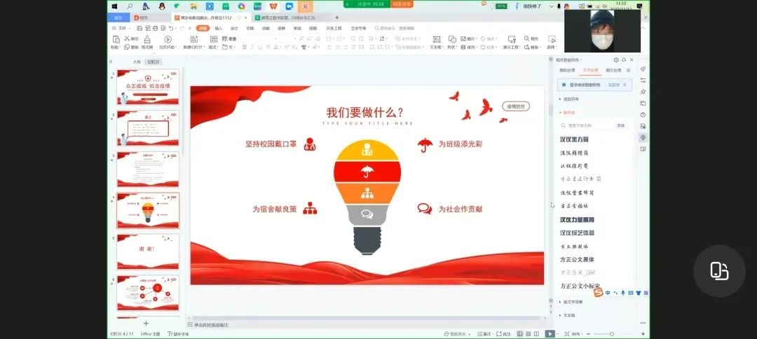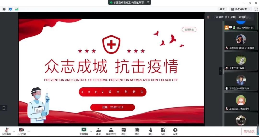 高翔老师就当前疫情形势做了详述,并提醒同学们要严格遵守公司防控措施,出宿舍必须科学佩戴口罩,履行核酸检测义务。每一位同学都应加强防疫的意识和责任感,在面对医务人员的时候,应怀有一颗感恩的心。