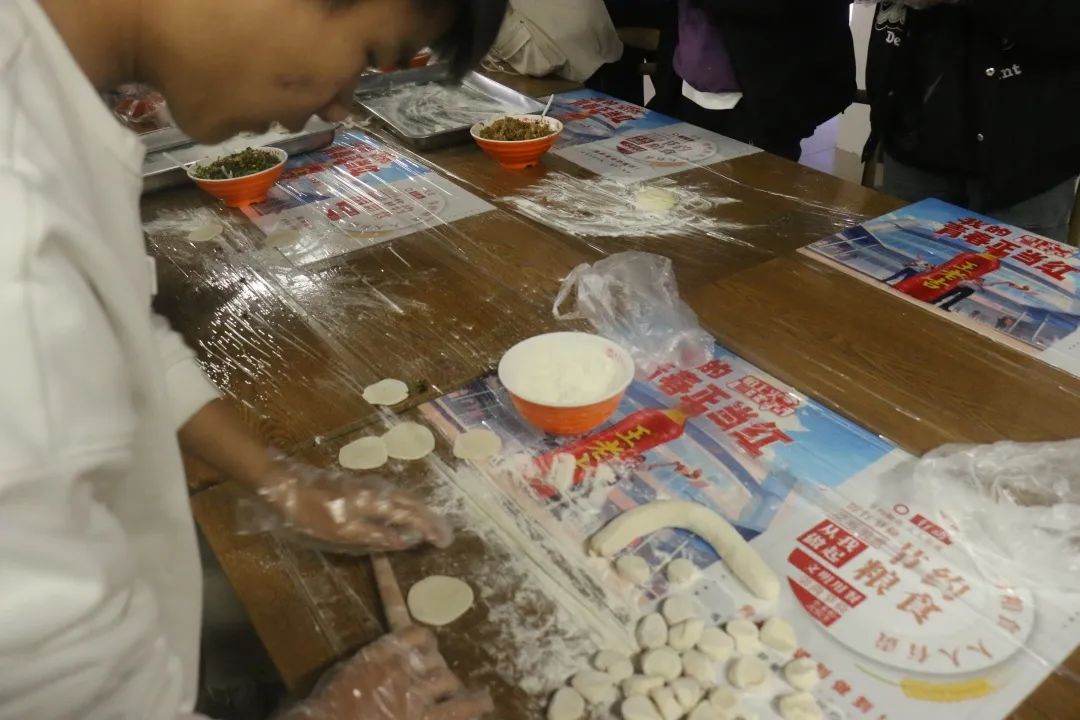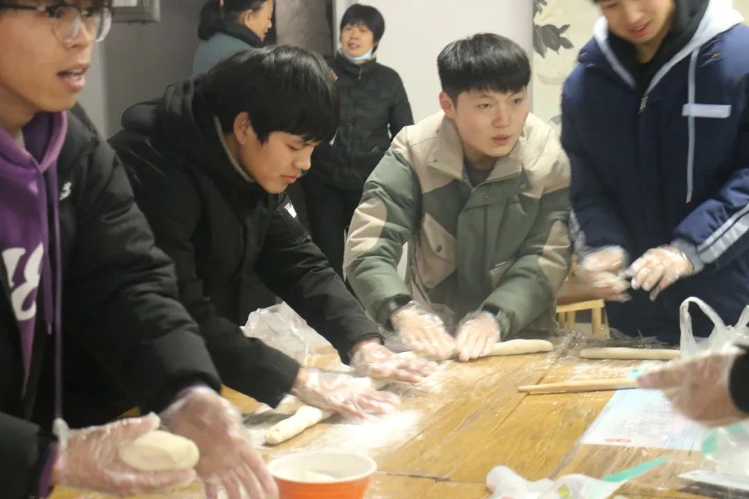 齐聚一堂,分工合作,八仙过海,各显其能,和面、擀皮、切菜、剁肉、调馅儿、边包边聊……同学们在快乐之中做着十分有意义的事情。