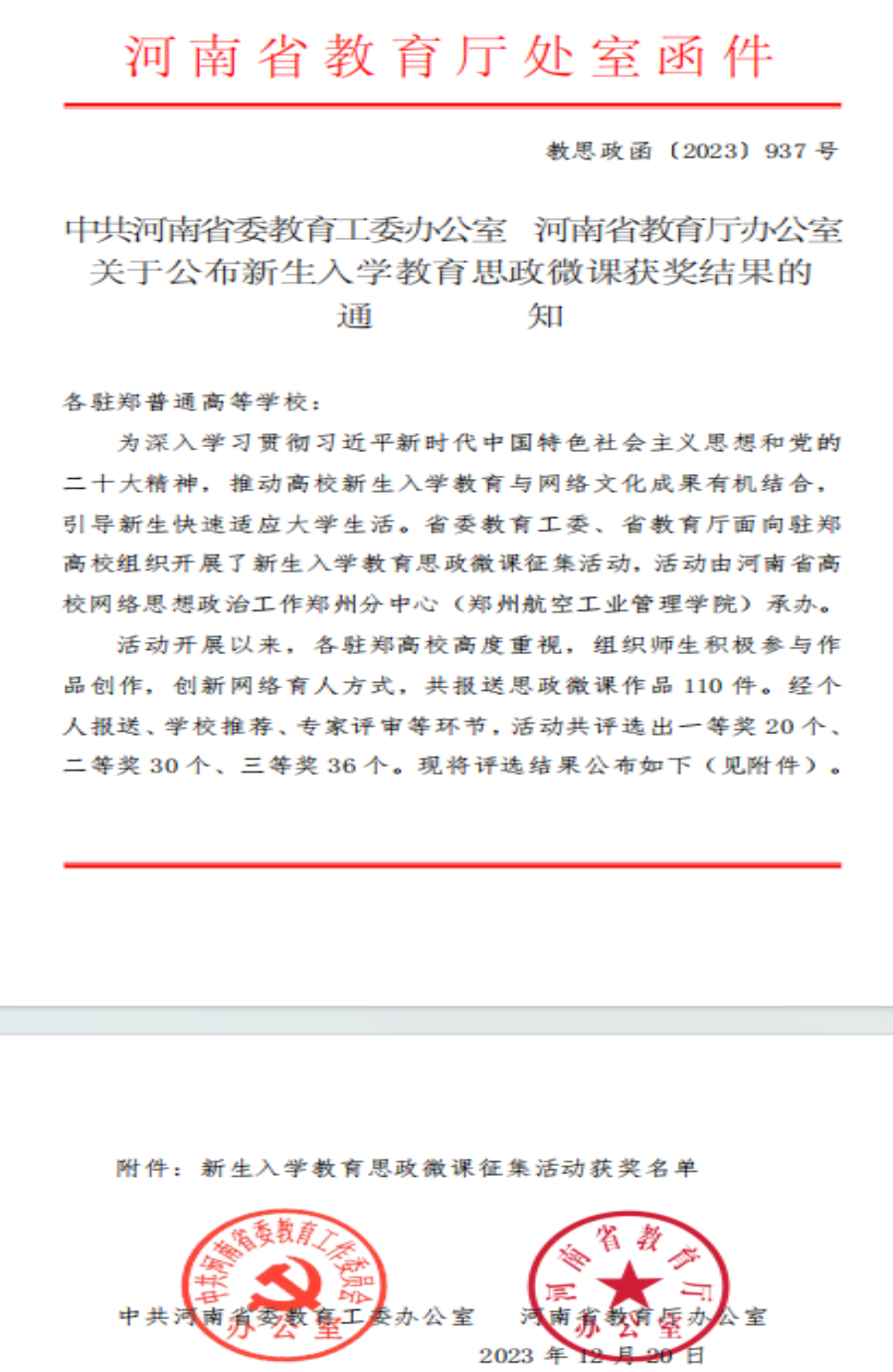 近日,从《中共河南省委教育工委办公室 河南省教育厅办公室关于公布新生入学教育思政微课获奖结果的通知》(教思政函〔2023〕937号)中获悉,公司报送的《老员工怎样入党》获新生入学教育思政微课三等奖。