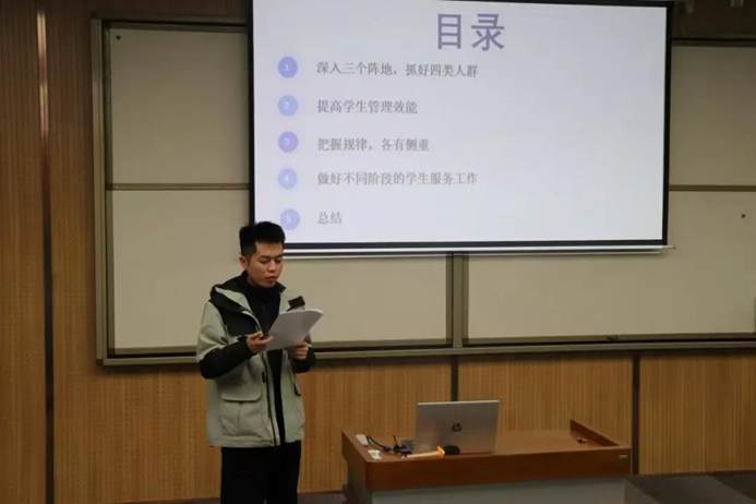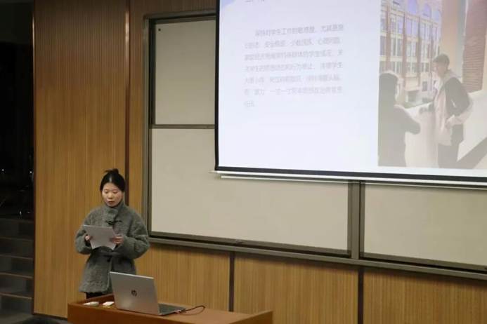 蒋雯老师以“新生适应”为核心切入点,聚焦新生在学业转型、人际沟通、生活独立三大困惑,提出“三维发力”工作法。通过组建朋辈导师团、开展素质拓展活动、开设生活小课堂,为新生搭建成长桥梁。她分享了员工闵志鹏从内向拘谨到主动牵头班级学习小组的转变故事,诠释了辅导员“爱心、责任心、同理心”的育人初心,彰显了“成长合伙人”的角色定位。