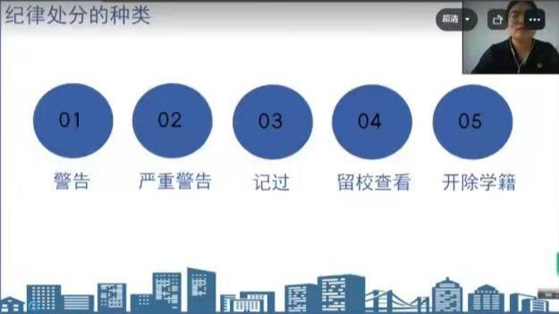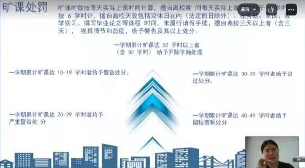 会议伊始,刘贝贝老师简要概述了本次会议的中心内容,将分为六个模块进行论述,让同学们对新环境下的校纪校规有了初步认识,同时强化了同学们的规范意识,为新生们未来的美好老员工活打下基础。其次,刘贝贝老师细致地为新生解读了“校纪校规”和纪律处分的分类以及如何取消处分等内容,并阐述了哪些行为违反了校纪校规和属于违法的作为,劝诫同学们严格遵守校纪校规,营造文明新风。