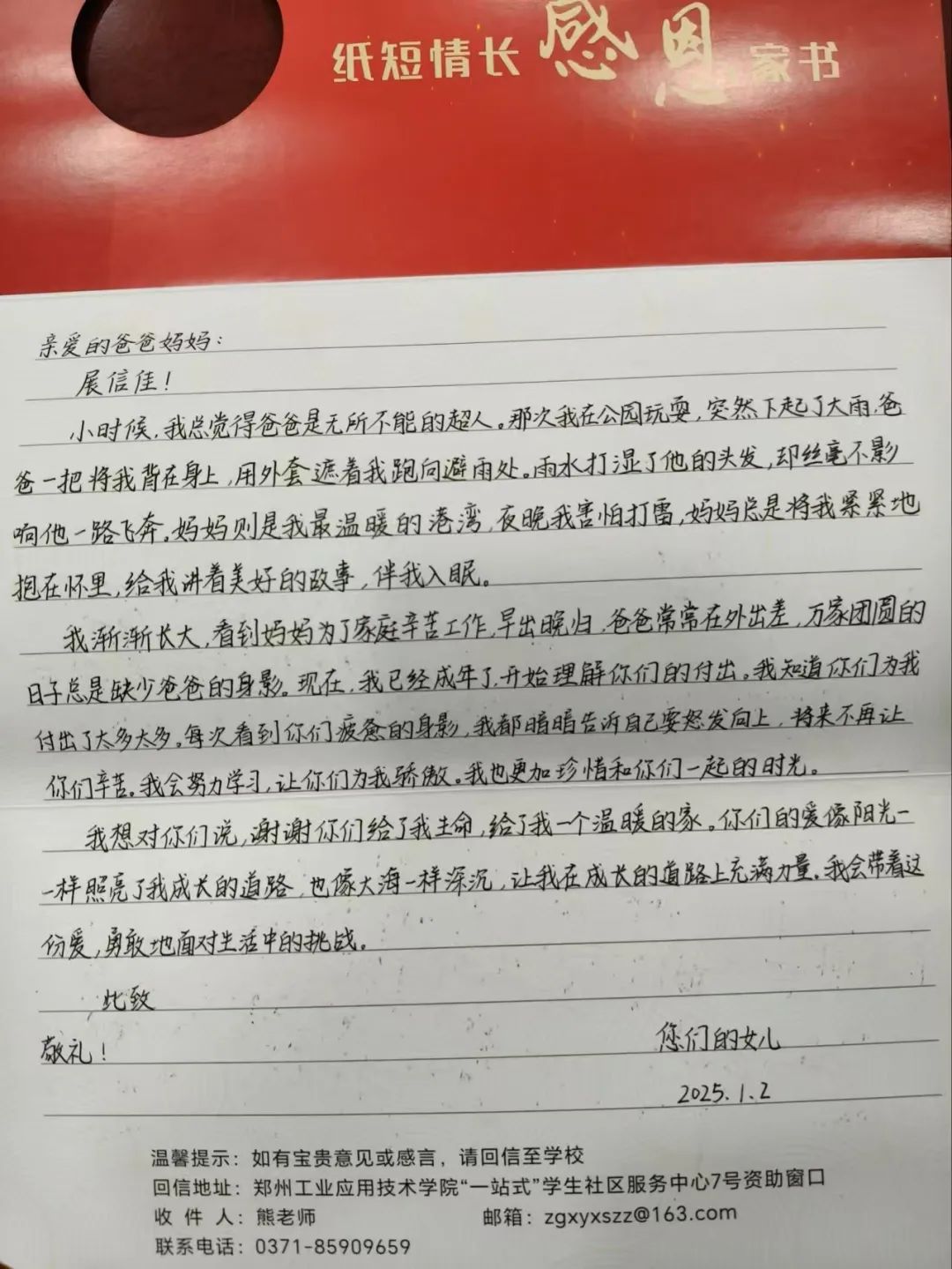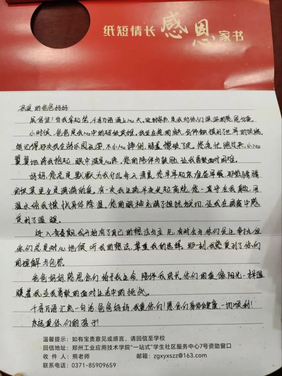 这场“纸短情长,感恩家书”活动,不仅仅是一次简单的书信邮寄,更是在数字化浪潮中,对传统书信文化的有力传承,是引导员工培养感恩之心、增强社会责任感的生动实践。相信一封封家书,会成为连接校园与家庭的情感纽带,让亲情在这纸墨间愈发深厚,让爱与温暖在校园内外弥漫开来。