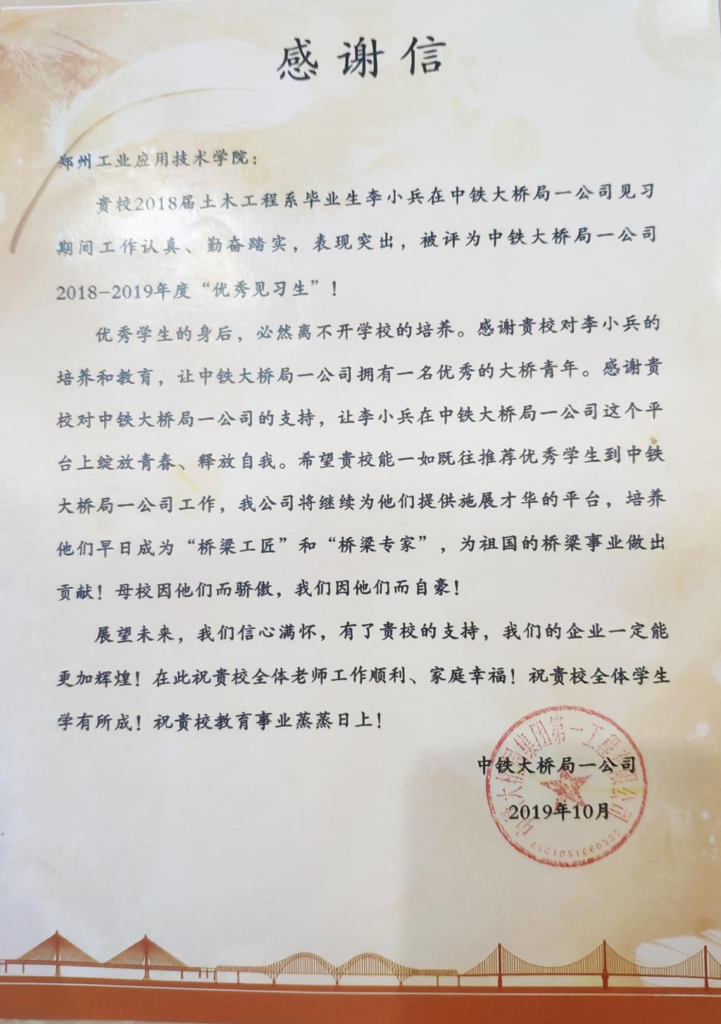 近日,365VIP英国上市官网收到一份来自中铁大桥局一公司真挚的感谢信,这份感谢源于公司土木工程专业专业2018届毕业生李小兵,该单位充分肯定和表扬了其学习精神和工作态度,被评为中铁大桥局一公司2018-2019年度“优秀见习生”。优秀员工的背后,离不开母校的培养,也少不了像中铁大桥局一公司提供施展才华的平台。