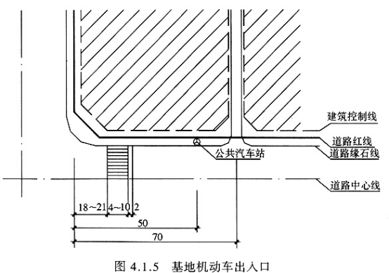 4.1.5 本条各款是维护城市交通安全的基本规定。第1款是按大中城市的交通条件考虑的。70m距离的起量点是采用交叉口道路红线的交点而不是交叉口道路平曲线(拐弯)半径的切点,这是因为已定的平曲线半径本身就常常不符合标准。70m距离是由下列因素确定的:道路拐弯半径占18~21m;交叉口人行横道宽占4~10m;人行横道边离停车线宽约2m;停车、候驶的车辆(或车队)的长度;交叉口设城市公共汽车站规定的距离(一般离交叉口红线交点不小于50m)。综合以上各因素,基地道路的出人口位置离城市道路交叉口的距离不小于70m是合理的。当然上述情况是指交叉口前车行道上行方向一侧。在车行道下行方向的一侧则无停车、候驶的要求,但仍需受其他各因素的制约。距离地铁出人口、公共交通站台原规定偏小,参照有关城市的规定适当加大了距离。