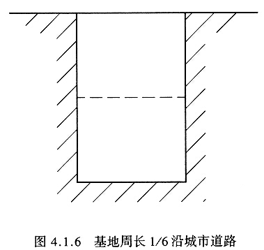 4.1.6 人员密集建筑的基地对人员疏散和城市交通的安全极为重要。由于建筑使用性质、特点和人员密集程度不一,故本条文只作一般规定,专用建筑设计规范和当地城市规划行政主管部门应根据具体情况作进一步规定。图4.1.6为基地周长1/6沿城市道路的示意图。