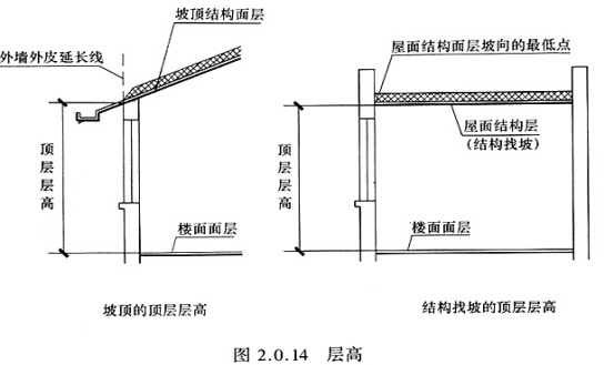 2.0.14 顶层的层高计算有几种情况,当为平屋面时,因屋面有保温隔热层和防水层等,其厚度变化较大,不便确定,故以该层楼面面层(完成面)至屋面结构面层的垂直距离来计算。当为坡顶时,则以坡向低处的结构面层与外墙外皮延长线的交点作为计算点。平屋面有结构找坡时,以坡向最低点计算,详见图2.0.14。