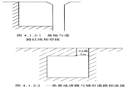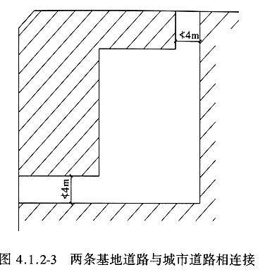 4.1.2 基地应与道路红线相邻接。由于基地可能的形状与周边状况比较复杂,因此对连接部分的长度未作规定,但其连接部分的最小宽度是维系基地对外交通、疏散、消防以及组织不同功能出入口的要素,应按基地使用性质、基地内总建筑面积和总人数而定。3000m2是小型商场、幼儿园、小户型多层住宅的规模,以此为界规定基地内道路不同要求。